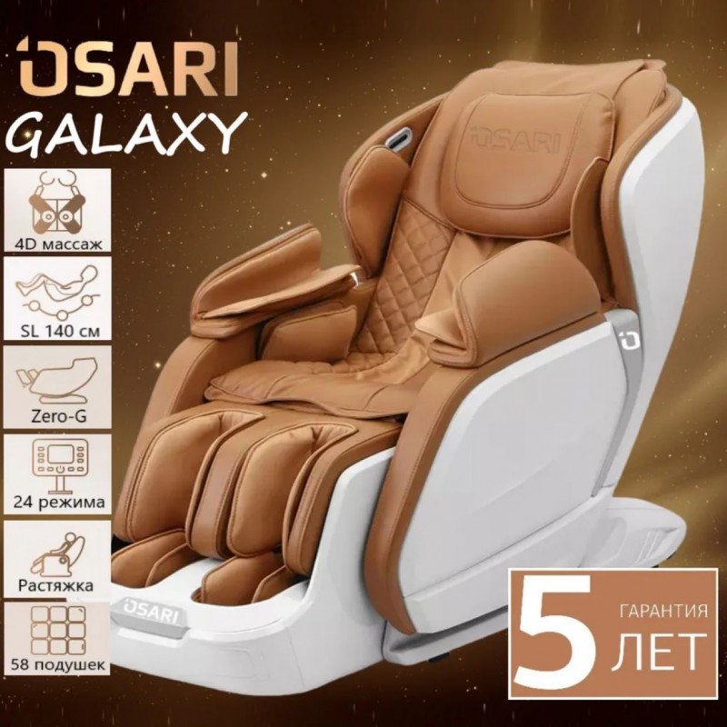 Массажное кресло Osari Galaxy объединяет в себе: 4D роликовый механизм последнего поколения (глубинная и детальная проработка всех групп мышц), 24 автоматические программы (индивидуальный массаж для каждого пользователя), расширенное ручное управление, полностью автоматическая массажная подножка с роликами на икрах и стопах, режим невесомости Zero-G, режим "Колыбель" (покачивание во время массажа), 58 воздушно-компрессионных подушек для лимфодренажного массажа, инфракрасный прогрев спины и стоп, а также “тайская растяжка”. Кресло имеет не большие габариты за счет уникального расположения воздушно-компрессионных подушек для рук и функцию экономия пространства (7 см от стены). Удобное расположение при ограниченном пространстве